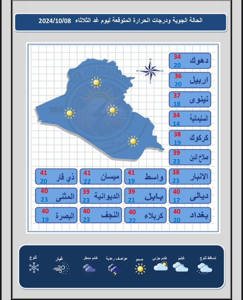 الحالة الجوية ودرجات الحرارة المتوقعة ليوم غد الثلاثاء