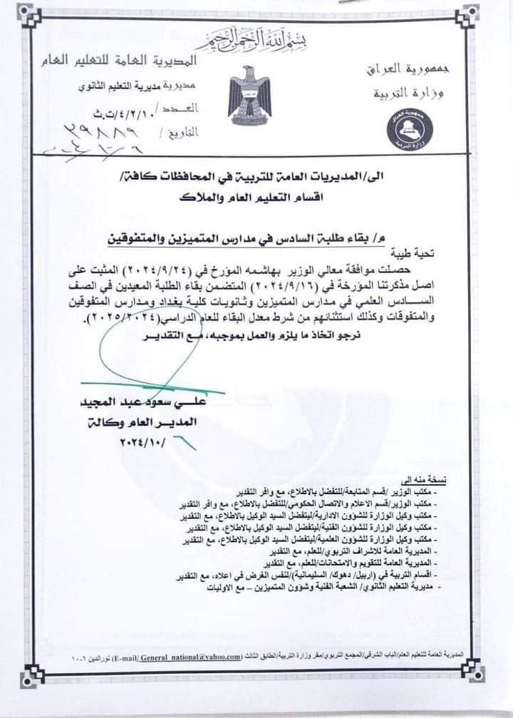 أصدرت وزارة التربية قراراً يقضي ببقاء الطلبة المعيدين في الصف السادس العلمي في مدارس المتميزين وثانويات كلية بغداد ومدارس المتفوقين والمتفوقات واستثنائهم من شرط معدل البقاء للعام الدراسي 2024-2025