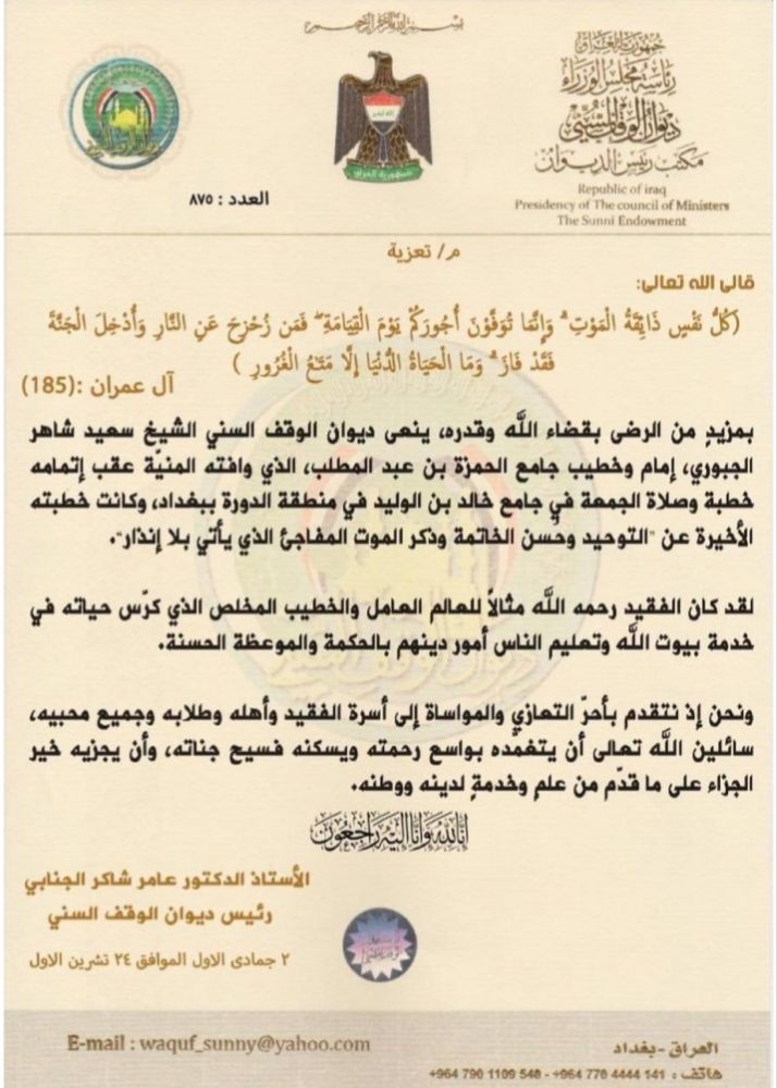وقال الديوان في بيان تلقت “منصة اخبار العراق ” نسخة منه، “ينعى ديوان الوقف السني الشيخ سعيد شاهر الجبوري، إمام وخطيب جامع الحمزة بن عبد المطلب، الذي وافته المنية عقب إتمامه خطبة وصلاة الجمعة في جامع خالد بن الوليد في منطقة الدورة ببغداد، وكانت خطبته الأخيرة عن التوحيد وحسن الخاتمة وذكر الموت المفاجئ الذي يأتي بلا إنذار”.