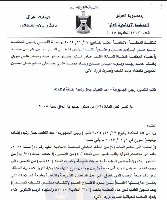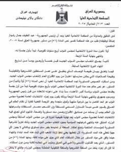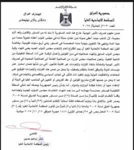 Thank you for reading this post, don't forget to subscribe!حصلت “منصة اخبار العراق “، اليوم الاثنين (17 تشرين الثاني 2025)، على النص الكامل لتعليق المحكمة الاتحادية العليا بشأن تفسير رئيس مجلس القضاء الأعلى فائق زيدان للمدد الدستورية المتعلقة بالانتخابات، وذلك بعد قرارها الجديد بإنهاء أعمال مجلس النواب وتحويل الحكومة إلى تصريف أعمال.