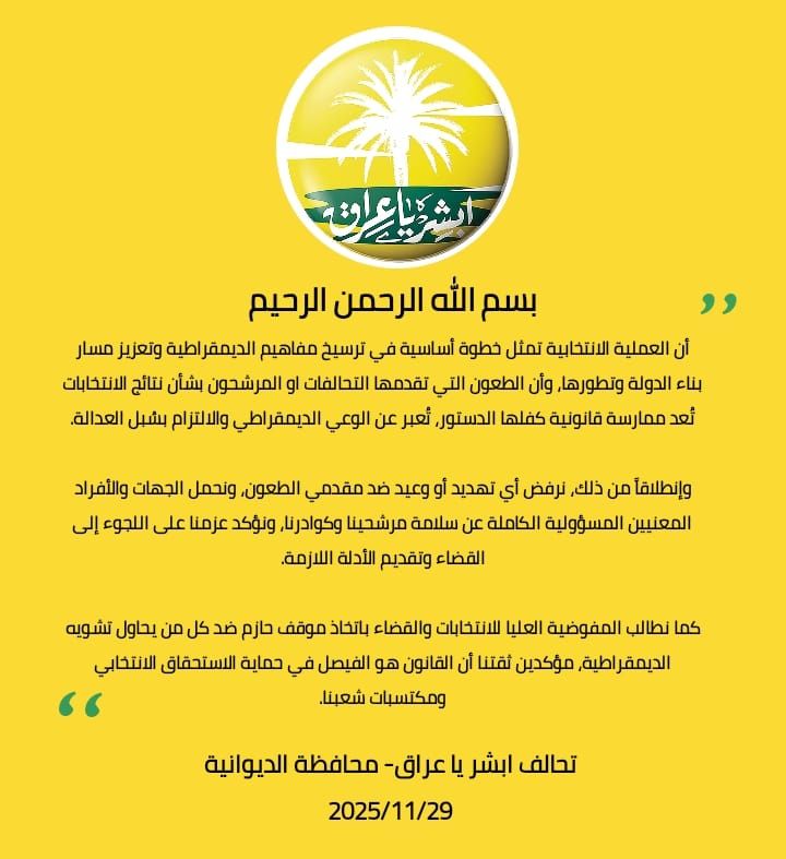 عاجل.. بيان من تحالف ابشر يا عراق في الديوانية